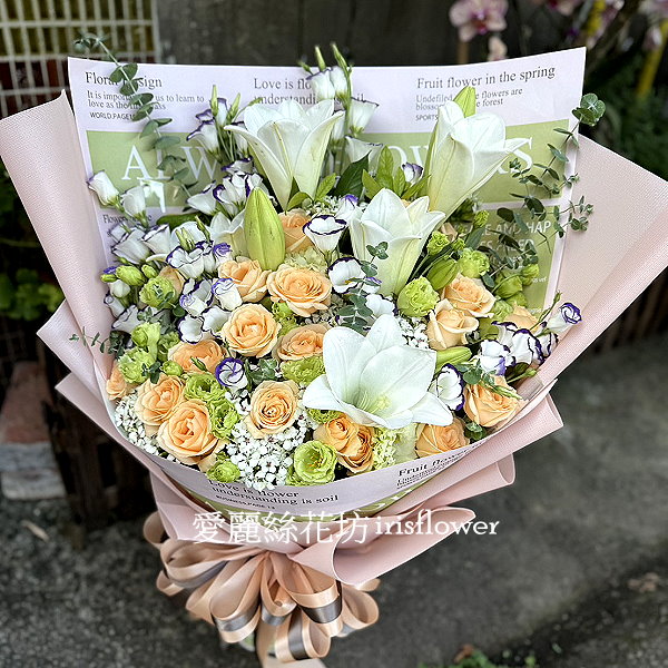 注意事項:因花卉常有季節性暫時短缺的問題,若圖片中花卉因季節性或不可抗力之因素短缺,本店將自動以當令相當之花材代替。